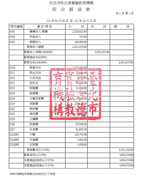 機構符合非營性原則,經費來源、財務規劃健全及收費規定合理,招生簡章載明每學年度收取費用之項目、數額及用途,對家長與實驗教育參與者公開財務報告,並於網路公告。